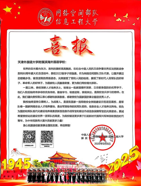 在隆重举行的纪念中国人民抗日战争暨世界反法西斯战争胜利80周年盛大活动中,荣耀体育官方网站_荣耀体育jiangnan(中国)附属滨海外国语学校(以下简称“滨海小外”)2022届毕业生邢逸晨作为中国人民解放军网络空间部队方队代表,以昂扬的姿态和整齐的步伐光荣通过天安门广场,接受党和人民的检阅。阅兵场上,邢逸晨步伐铿锵、意气风发,展现了新时代革命军人的良好风貌,彰显了新时代人民军队的强军风采。他以出色的表现赢得了广泛赞誉,为国家和军队赢得了荣誉。在滨海小外6年培养期间,邢逸晨表现优异,品德端正,勤奋好学,心怀家国,立志国防。他的成长成才,是学校始终坚持立德树人、深耕人才培养的生动体现。学校十分重视学生爱国主义教育和国防意识培养,鼓励