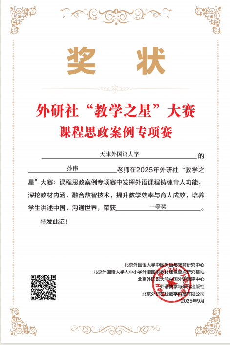 近日,天外通识教育学院教师孙伟在2025年外研社“教学之星”课程思政案例专项赛中荣获一等奖。该赛事以“外语教材的有效使用:讲述中国 沟通世界”为主题,旨在搭建沟通交流外语课程思政育人实践的平台,全面提升课程思政建设深入性、创新性与有效性,助力高校服务国家战略、培养堪当民族复兴重任的时代新人。孙伟凭借对课程思政内涵的深刻理解,深入挖掘外语教材中的思政元素,创新结合数智技术优化教学流程,在提升教学效率的同时强化育人成效,有效引导学生提升“讲好中国故事、促进国际沟通”的能力。此次获奖,不仅是其个人深耕外语教学领域、持续探索课程思政创新实践的成果,更印证了学校在教师队伍建设与教学质量提升工作上的扎实成