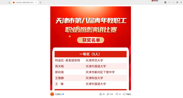 9月10日,由天津市教育工会主办的天津市第八届青年教职工职业道德演讲大赛圆满结束。本届大赛以“淬炼师德师风 践行育人使命”为主题,汇聚了全市教育系统62名优秀青年教职工代表同台竞技。参赛选手们以深刻的思考、真挚的情感,生动展现了新时代天津青年教育工作者的职业追求与使命担当,呈现出一场内涵丰富的师德师风教育盛会。 学校高度重视青年教职工队伍师德师风建设,通过开展校级选拔,严格评审、优中选优,进行赛前指导与培训,组织二十余名师生现场观赛。经过激烈的竞赛,校党委宣传部教师蒋天皓、国际商学院教师王臻凭借出色的表现,均荣获大赛一等奖。两位教师在演讲中,紧密围绕各自岗位的育人事迹,从“给迷茫者点灯,为淋雨