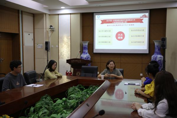 为全面贯彻习近平总书记关于教育的重要论述,深入落实《中共中央国务院关于全面深化新时代教师队伍建设改革的意见》,推进实施教育部等七部门《关于加强和改进新时代师德师风建设的意见》,9月16日上午,马克思主义学院直属党支部组织全体教师在逸夫楼大江厅进行集体学习,支部书记郑海呐以《为学、为事、为人相统一,做学生的领路人------学习习近平总书记给全国高校黄大年式教师团队代表重要回信精神》为题进行师德专题宣讲。郑海呐宣读了《习近平总书记给全国高校黄大年式教师团队代表的回信》以及总书记在2017年对黄大年同志先进事迹作出的重要指示,并为在场教师介绍了黄大年同志的先进事迹,鼓励大家以黄大年同志为榜样,努力学习黄大年式教师团队的优秀品质和教学科研方法,将师德师风教育落到实处。她重点总结分享了全国优秀思想政治理论课教师的基本特质以及全国思政课影响力标兵人物的卓越特质,鼓励大家一定要明确“三个塑造”“三个传播”,始终坚持“六个要”,力争成为“四有”好老师、“四个引路人”。会后大家纷纷表示,此次宣讲活动凝聚共识、鼓舞人心,今后将继续大力弘扬崇高的师德师风,坚持做到以德立身、以德立学、以德施教,高标准铸师魂