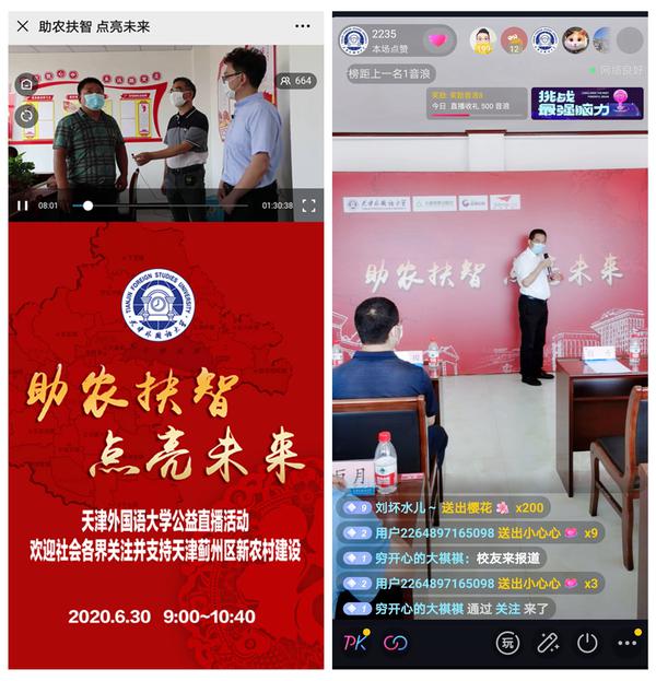 6月30日,学校党委联合天津出版传媒集团,开展“助农扶智 点亮未来”网络公益直播活动;10月,举办甘肃甘南藏族自治州合作市骨干教师研修班,10月—11月,举办新疆和田地区教育局基础英语教师综合能力提升研修班,大力支持天津市对口援建工作。10月-12月,举办“鲁班工坊”教师英语培训,服务天津职业教育国际化发展。