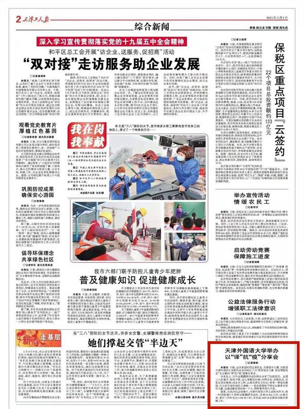 《天津工人报》以《荣耀体育官方网站_荣耀体育jiangnan(中国)以“译”抗“疫”分享会》为题目进行了报道。