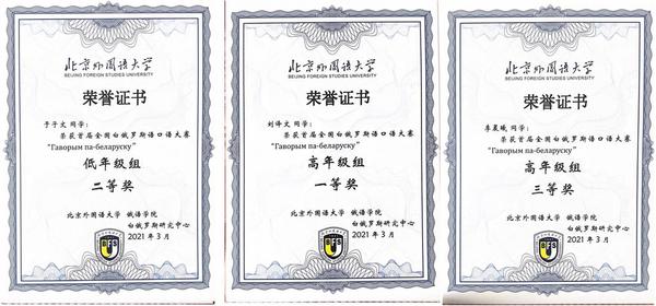 本次大赛包括命题演讲和诗歌朗诵两个环节。自2020年12月以来,我校白俄罗斯语专业积极组织报名,同学们参赛热情高涨,最终有14名同学参加比赛,在寒假期间通过线上教学方式,在专业教师指导下反复训练,精心准备。比赛共决出低年级组、高年级组一、二、三等奖共12名。我校白俄罗斯语专业2017级刘译文同学脱颖而出,以过硬的专业素质和优秀表现夺得高年级组一等奖;2017级李晨曦同学获高年级组三等奖;2019级于子文同学获低年级组二等奖;我校教师国晶和沙哈卜·奥莉加获优秀指导教师奖。