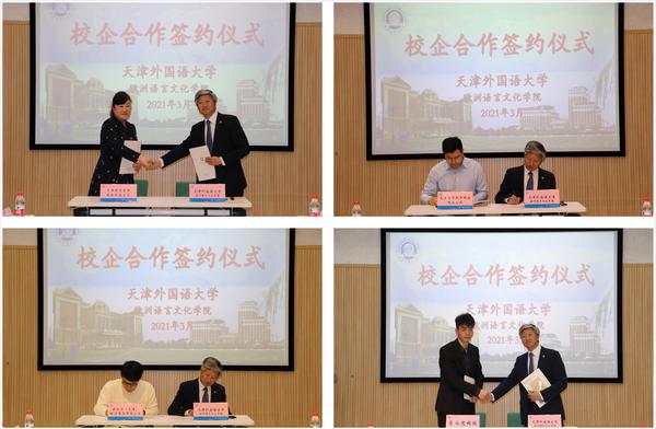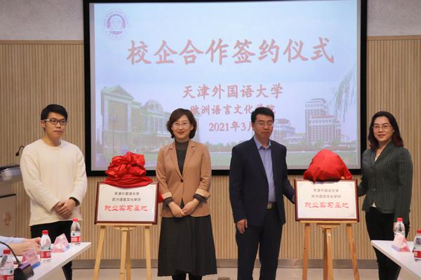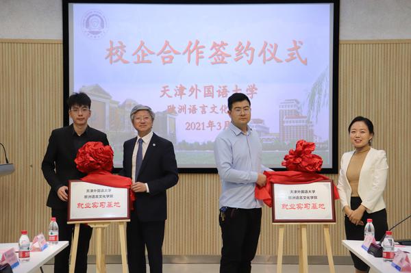 签约仪式上,学院党委书记安娜代表全体师生对与会嘉宾表示热烈欢迎,并简要介绍了学院的发展历程、专业建设、人才培养及学生就业等基本情况。副院长史亚军代表学院分别与企业代表共同签署校企合作协议。招生就业处处长于敬、欧洲语言文化学院负责人与企业代表共同为就业实习基地揭牌。
