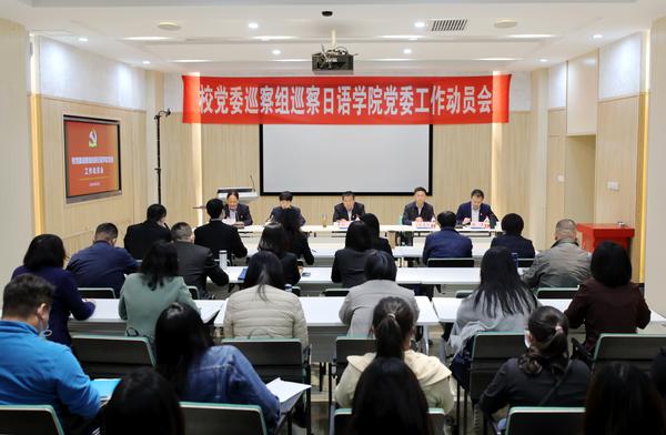 党委巡察办、巡察组全体同志,高级翻译学院和日语学院领导班子成员、全体教师及学生党员代表参加了会议。