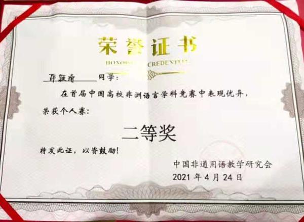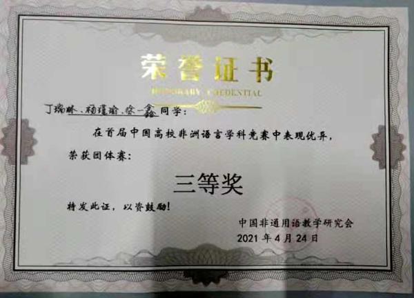 丁瑞林、杨瑾瑜、徐一鑫组成的代表队获得团体赛三等奖 我校师生参加2021年全国非洲语言教学研讨会