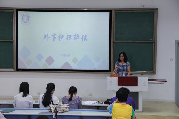 付美艳从国家安全、防疫安全、人身安全等方面为大家进行了外事纪律解读,提醒学生要遵守疫情防控要求,注意言行举止,牢记自己的一言一行代表着中国形象,做维护国家形象的中国青年。