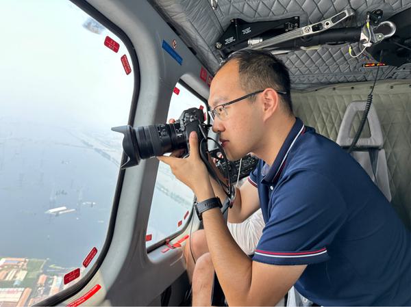 今年八月,海河流域一场60年以来最大的洪水向天津涌来。8月3日凌晨5点,孙凡越来到了位于津冀交界的台头镇人民政府,拍摄前线防汛抢险工作。台头镇依河而建,是大清河进入天津后流经的第一个村镇。撤离转移村民、万人昼夜抢险、不眠夜巡大堤,他跟随前线战士一起见证着人民军队在防汛一线的抢险行动。8月8日一早,驻守台头镇的他跟随执行任务的警航任务员,从空中俯瞰东淀蓄滞洪区的水情。以“汛”为令、闻“汛”而行------在抗洪一线与前线人员共同驻守后,他对这场60年一遇的洪水及记者的职责所在理解也更为深刻。作为党和人民的“耳目喉舌”,奔赴一线以正视听,见微知著传递温暖,这便是记者的职业使命。