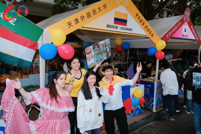 漫步在各个展位间,哥伦比亚的同学们热情地邀请游客们跳起昆比亚,尽显南美的热情奔放和舒畅欢愉;韩国同学用五颜六色的颜料打造的面部彩绘绚丽精致;日本同学和游客们一起折叠千纸鹤,寄予心想事成的美好愿望;贝宁的美食引得大家赞不绝口;哈萨克斯坦的传统服装试穿体验让人们仿佛置身广袤的大草原……琳琅满目的各国手工艺品、特色小吃,天津非遗文化体验区等彰显着不同的民族风情和文化内涵,吸引游客们倾听、体验。现场特设的天外本科生、研究生招生宣传展位和留学生招生宣传展位前人头攒动,不少市民前来咨询交流。