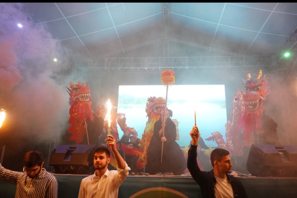 夜幕降临后,中国美食文化展示环节开始了,中国厨师将“火焰牛肉”搬上舞台,娴熟的手法和升腾的火焰让观众们惊奇不已,连连喝彩。紧接着,三条长达十米的舞龙登场,金色的龙鳞在灯光下闪耀,龙头龙尾的动态摆动将现场气氛推向顶峰,神龙所到之处人们激动得欢呼雀跃。