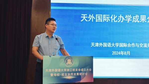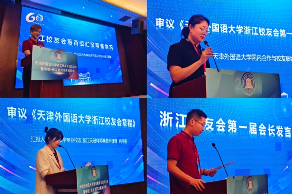 2003级英语专业校友、海伦艺术教育投资有限公司总经理顾箐介绍了浙江校友会的前期筹备情况。会上审议通过了天外浙江校友会章程和第一届理事会名单。在校友们的共同见证下,程国毅代表学校向浙江校友会授旗。新当选的第一届会长——2002级日语专业校友、杭州逸云国芯科技有限公司执行董事兼总经理刘万佳作为校友代表发言。他表示,浙江校友会将秉承“共聚情谊,共享资源,共赢未来”的宗旨,充分发挥校友会的桥梁纽带作用,为校友们提供优质的服务和广阔的交流平台,积极促进母校与浙江的交流与合作,为母校的发展贡献智慧和力量。