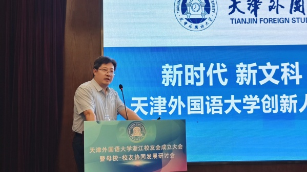 正值天外代表一行与浙江、上海、北京三地校友欢聚一堂的难得契机,成立大会同步举办了“母校—校友协同发展研讨会”,旨在深化校友与母校之间的情感纽带,共同探讨并推动天外与校友在多个领域的协同发展。会上,教务处处长王济军以“新时代、新文科、新使命”为主题,生动地阐述了天外“创新人才培养项目”的核心理念与实施路径,展现了学校在新时代背景下的教育使命与担当。国际合作与交流处处长张占奇分享了近年来天外在国际化办学等方面取得的丰硕成果,彰显了天外在全球视野下的开放姿态与卓越成就。