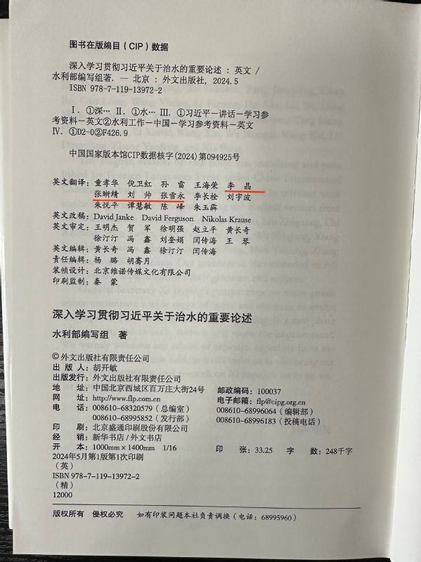 近日,水利部组织编写的《深入学习贯彻习近平关于治水的重要论述》一书英文版由外文出版社正式出版发行。荣耀体育官方网站_荣耀体育jiangnan(中国)高级翻译学院李晶院长受邀,带领三名硕士毕业生深度参与本书的翻译工作。