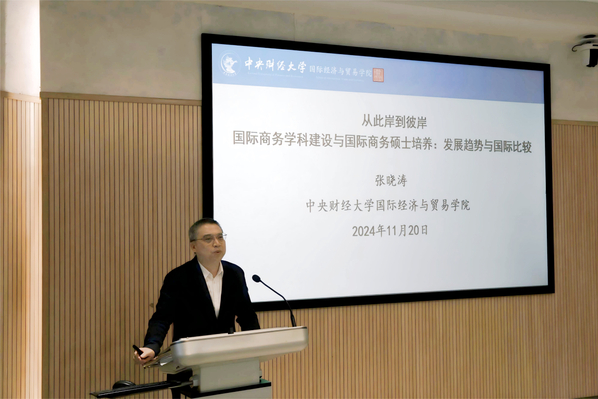 全国国际商务专业学位研究生教育指导委员会委员、中央财经大学国际经济与贸易学院院长、教授、博士生导师张晓涛作题为《国际商务学科建设与国际商务硕士培养:发展趋势与国际比较》的学术报告,详尽分析了国际商务学科建设的新背景和面临的新环境,阐述了国际商务硕士培养存在的问题,并从国际商务硕士培养的国际经验视角,提出了国际商务硕士产教融合的探索之道。