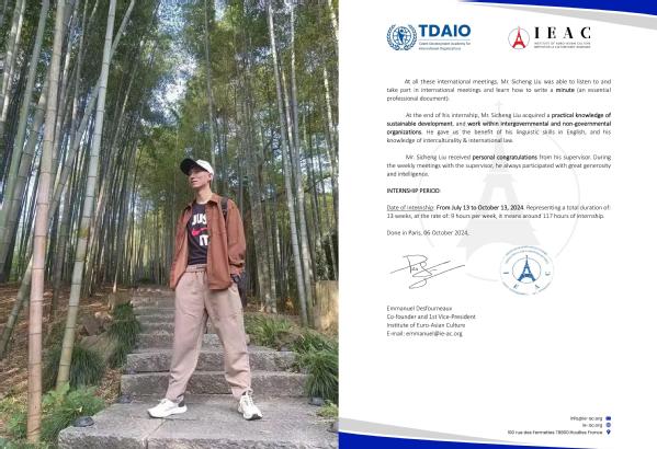 他说:“通过在国际组织实习,我接触到国际组织的工作环境和工作方式,也了解了国际组织的相关事项与运作模式,掌握了如何撰写联合国报告的技能。我在实习期间收获满满,对未来在国际事务舞台上发挥自身作用充满信心。”