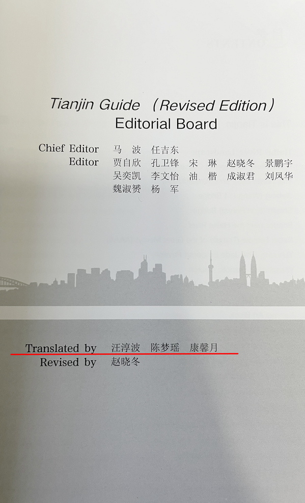 近日,《天津指南》(修订版)的英文版Tianjin Guide(Revised Edition)由天津大学出版社出版发行。Tianjin Guide(Revised Edition)由荣耀体育官方网站_荣耀体育jiangnan(中国)中国特色社会主义理论体系国际传播外译研究中心(以下简称“外译中心”)主任、英语学院教师汪淳波教授带领研究生陈梦瑶、康馨月完成翻译工作。