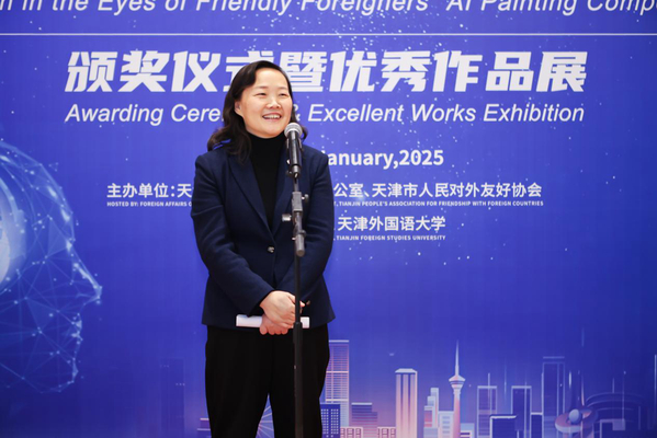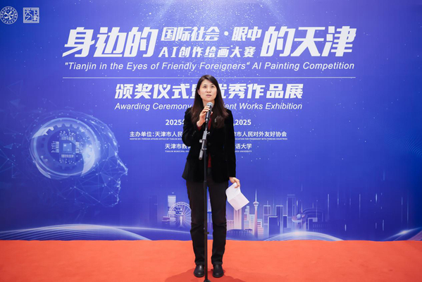 黄春艳在致辞中对获奖的外国朋友表示热烈祝贺。她表示,外籍人士借助AI技术描绘了天津之美,展现了“身边的国际社会”眼中的魅力津城和大家对天津的热爱之情。市外办(友协)将继续聚焦“身边的国际社会”,组织开展更多丰富多彩的民间外交活动,广交朋友、深化友谊,对外讲好“天津故事”,服务外籍人士更好融入天津。希望越来越多的外国友人能够关注天津、理解天津、支持天津、拥抱天津,凝聚更广泛的智慧力量,共同推进天津城市国际化建设,服务推动构建人类命运共同体。