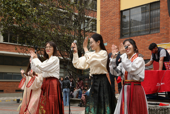 吕书晗、景晶、李昕睿、姜嫚4位汉语志愿者教师精心筹备的节目将活动推向高潮。一曲热情奔放的《最炫民族风》,以其动感的旋律和欢快的节奏,带动全场观众的情绪;温馨感人的舞蹈《相亲相爱一家人》,舞者们用优美的舞姿传递出温暖与团结,让现场充满了浓浓的温情。这些精彩节目赢得了现场观众的众多好评,掌声和欢呼声此起彼伏,整个活动现场沉浸在一片欢乐祥和的氛围之中。