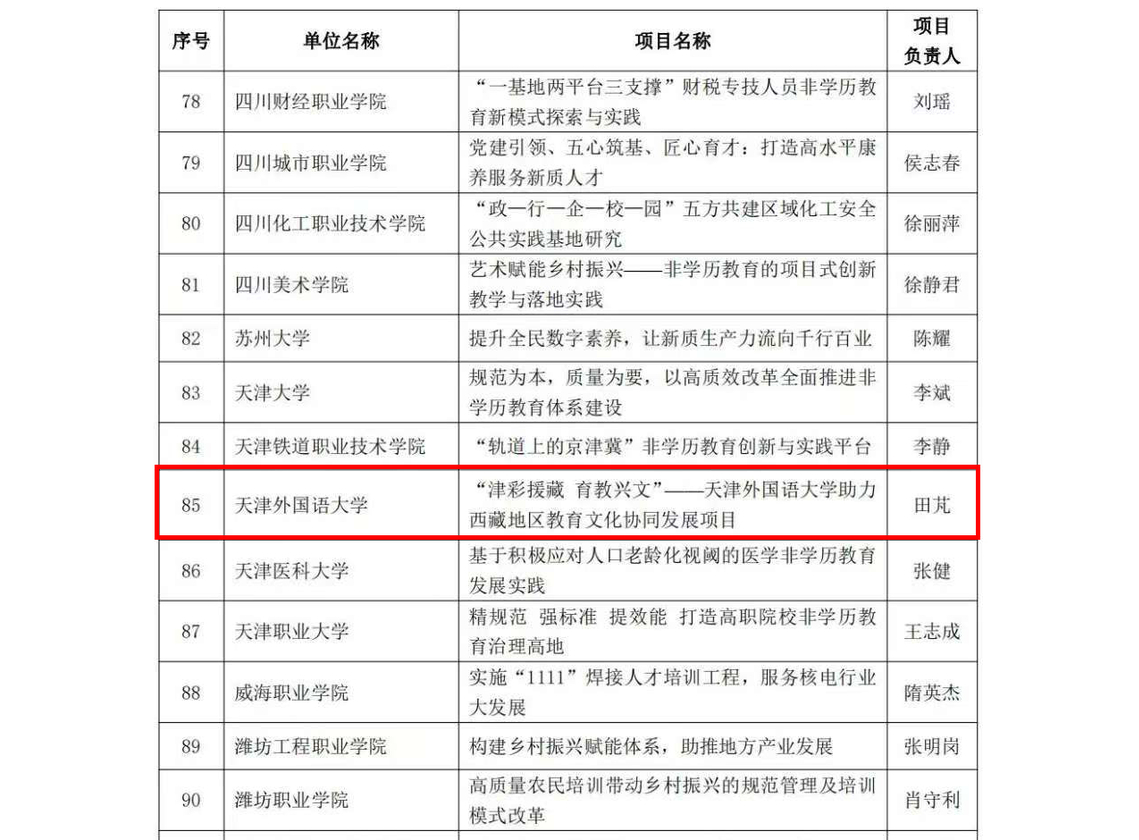 近日,教育部公布了2024年学习型社会建设重点任务(高等继续教育领域)培育建设名单。我校继续教育学院田芃主持的《“津彩援藏 育教兴文”——荣耀体育官方网站_荣耀体育jiangnan(中国)助力西藏地区教育文化协同发展项目》成功入选非学历教育改革创新任务名单。(本段用蓝色框底编辑)