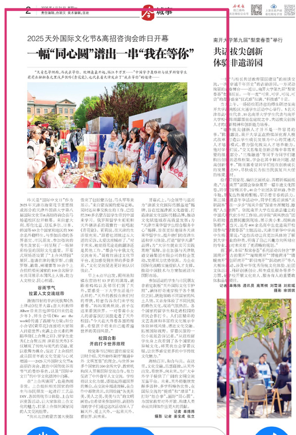 激情四射的非洲民族舞《热土律动》拉开大幕;意大利教师Albert带来吉他弹唱《归来仍是少年》、师生合唱《We are the world》传递了温暖与力量;阳台小合唱《萱草花》直接将大家领入诗意世界;充满上合元素的舞蹈串烧《上合舞之彩》、留学生走秀《上合聚五洲 津彩呈天外》不仅展现了传统与现代的交融,更以歌舞为媒介,促进了上合组织成员国青年的文化交流与心灵相通……2025天外国际文化节&高招咨询会,就在中国传统谷雨节气的曼妙春色,以及“国际中文日”的中华文化浸润中启幕。