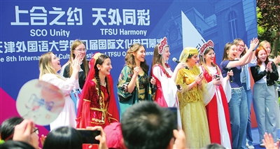 舞台上,动感音乐响起,来自俄罗斯的两名年轻姑娘唱起了节奏欢快的歌。她们的快乐感染着园区的每一个人。很快,身着不同民族服饰的留学生都加入其中,大家开心地边唱边跳。这一幕,让年过半百的俄罗斯外教伊琳娜感动万分。“中文让大家从世界各地相聚于此,而此刻,早已没有了国界之分,我们更像是心意相通的一家人。这是一首属于上合大家庭的歌。”伊琳娜说。