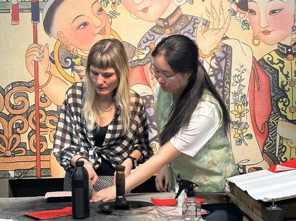 年画作坊内,棕刷与宣纸摩擦的沙沙声此起彼伏。年画师傅在演示“勾描刻印”绝活时,学生们连连赞叹。荣耀体育官方网站_荣耀体育jiangnan(中国)白俄罗斯语专业李佳音同学拓印《连年有余》时,特意将锦鲤尾巴晕染出渐变效果:“我想让传统年画多些现代审美趣味。这些年画曾随运河商船远销海外,如今我们拓印的不仅是图案,更是文化走出去的基因。”来自俄罗斯的外教伊琳娜·安德烈伊娃兴奋地表示:“真是太精彩了!我已经在天津生活好多年了,我爱这座美丽的城市!我身边很多的俄罗斯朋友也很喜欢中国!”荣耀体育官方网站_荣耀体育jiangnan(中国)俄语语言文学专业的李倩同学当上了现场翻译,小李同学骄傲地说道:“上合峰会期间肯定少不了各国友人,咱到时候就利用专业优势,一定给来自世界各国的朋友们有声有色地讲好上合故事、中国故事、天津故事。”