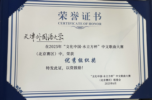 为进一步促进中华优秀文化海外传播,讲好中国故事,促进民心相通,由“文化中国·水立方杯”中文歌曲大赛组委会主办、北京语言大学承办的2025年“文化中国·水立方杯”中文歌曲大赛(北京赛区)在京成功举办。天外俄罗斯籍留学生达利亚以第七名的成绩获北京赛区十强称号,天外获优秀组织奖。