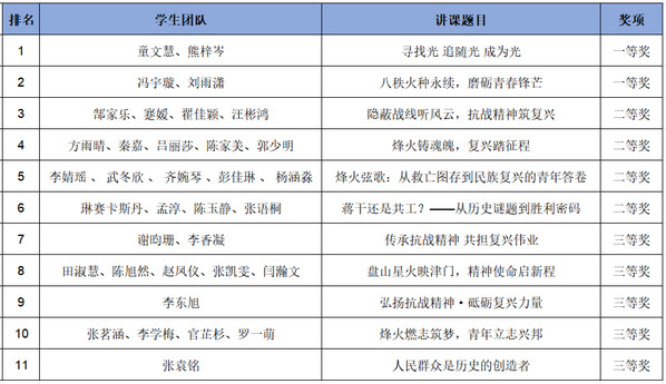 本次大赛自启动以来,得到广大学生积极响应。经过层层选拔,共有11支优秀团队晋级决赛。通过现场展示,各参赛团队结合历史与现实,精心设计课程,从不同角度阐释了抗战精神的丰富内涵。有的团队聚焦抗战英雄事迹,展现中华民族不屈不挠的民族气节;有的团队紧密结合当代青年使命,探讨如何在新时代传承和弘扬抗战精神;还有的团队用详实史料论证抗战精神的现实意义,并结合所学专业分析和平发展的时代使命……