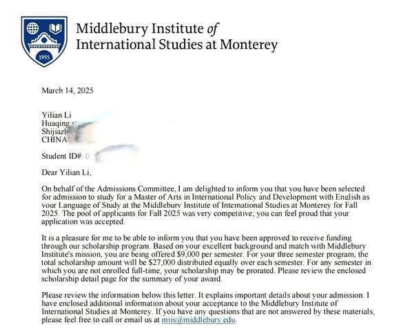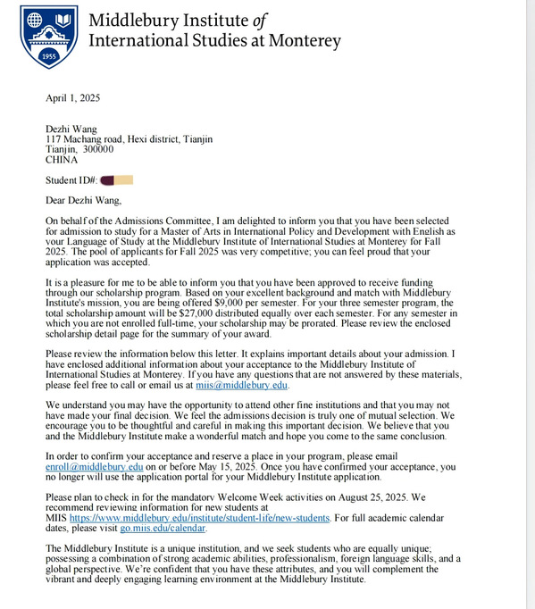 【2025年,美国蒙特雷国际研究院IPD项目联合中国国家留学基金委设立5个国际组织人才全额奖学金,天外学生获其中2个名额】