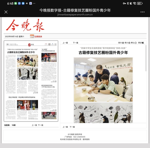 昨天下午,当阿曼师生和留学生步入天津图书馆古籍修复室,现场的文化气息扑面而来。古籍修复师为大家现场展示了古籍修复技艺的流程,演示“补、揭、托、裱”四大核心工序,并就“纸性分析”“浆糊调制”“虫霉防治”等关键技术作互动答疑。从古籍的破损原因分析到修复前的细致勘察,从纸张的选择到修补、装订等一系列步骤,修复师都进行了生动讲解,让大家对这项古老而精密的技艺有了初步的认识。