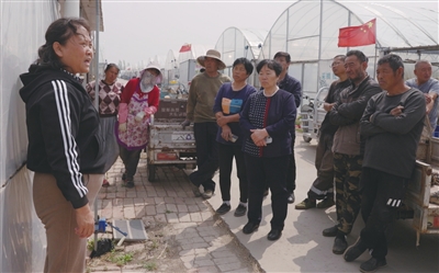 4月12日,天津农学院田淑芬研究员指导东丽区葡萄种植户应对大风天气开展农业设施加固,保住了400亩葡萄大棚免受损失。(摄影:王晓沛)
