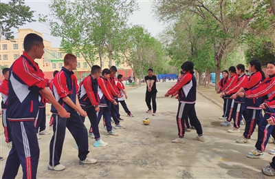 5月13日,天津体育学院援疆支教实习生杜晓剑为新疆和田地区策勒县第二中学的学生们教授排球基本技术。(摄影:申格)