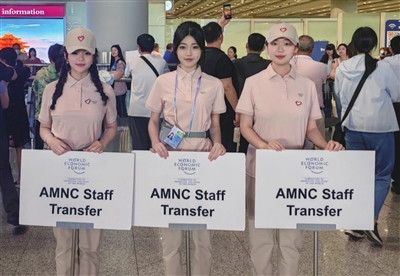 6月20日,天津财经大学80名志愿者投入到第十六届夏季达沃斯论坛的交通保障工作中,他们以双语能力与温暖笑容迎接全球来宾,举手投足间尽显礼仪之邦的文明风范。(摄影:杨雪松)