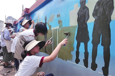 ▲6月30日,在南开区少年宫美术老师的悉心指导下,天津美术学院、天津师大南开附中、区少年宫的大中小学生,用画笔将南开誉英学校的围墙化作巨型涂鸦墙,用斑驳色彩描绘了“文明天津”“文明南开”,彰显深厚文脉。(摄影 孙乃燕 )