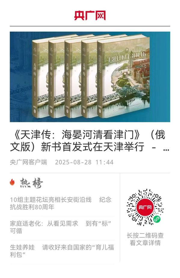 《天津传》以“文字纪录片”式的叙述,赋予城市历史以温度与情感。书中不仅记载历史名人的传奇、普通市民的智慧,更刻画了九河下梢的地理经纬与中西交融的文化景观,通过鲜活的人物与故事,勾勒出天津从古至今的文化脉络与城市精神。这座城市既承载中国近代“百年变局”的历史痕迹,也彰显着当下开放合作的时代气质。《天津传》(俄文版)为外国读者提供了一个理解中国近代化与全球化进程的鲜活样本,有助于彰显中国城市的包容性与现代性,促进深层次文化交流,推动文明互鉴与情感共鸣。