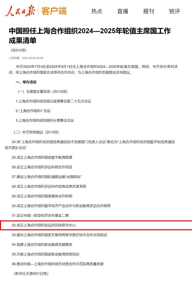 9月2日,中国担任上海合作组织2024—2025年轮值主席国工作成果清单正式公布,共计313项。