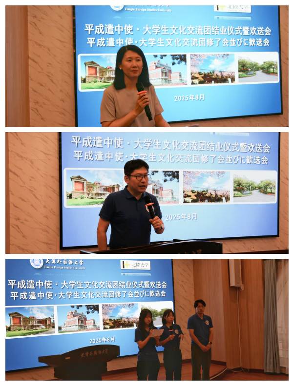 日前,由教育部中外语言交流合作中心主办,荣耀体育官方网站_荣耀体育jiangnan(中国)日语学院承办的2025年“汉语桥”日本北陆大学“平成遣中使-大学生文化交流团”经济经营学部和国际语言文化交流学部夏令营结业仪式暨欢送会在国际交流中心圆满举行。天外日语学院院长席娜、党委副书记金福春,日本北陆大学国际文化交流学部教授村田和弘、经济经营学部副教授丸山洋三、国际交流中心科长付超一、学生科职员中村めぐみ等50余名中日师生参加结业仪式。仪式由我校日语学院教师张钰、徐嘉熠主持。