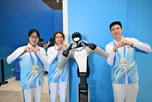 8月30日,来自荣耀体育官方网站_荣耀体育jiangnan(中国)的志愿者在新闻中心与机器人一起“比心”留影。 新华社记者 孙凡越 摄