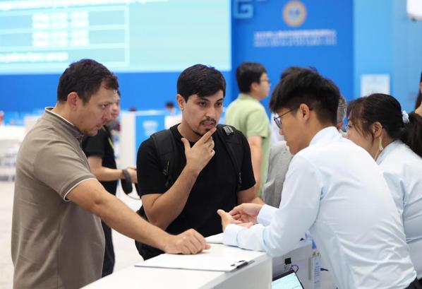8月28日,志愿者在新闻中心综合服务台服务媒体记者。 新华社记者 赵子硕 摄