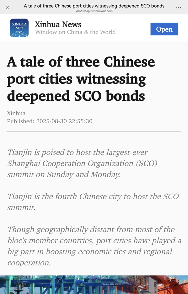 TIANJIN, Aug. 30 (Xinhua) -- Tianjin, a 600-year-old port city in north China, is poised to host the largest-ever Shanghai Cooperation Organization (SCO) summit on Sunday and Monday, underscoring China's commitment to enhancing regional cooperation and fostering dialogue across diverse civilizations.