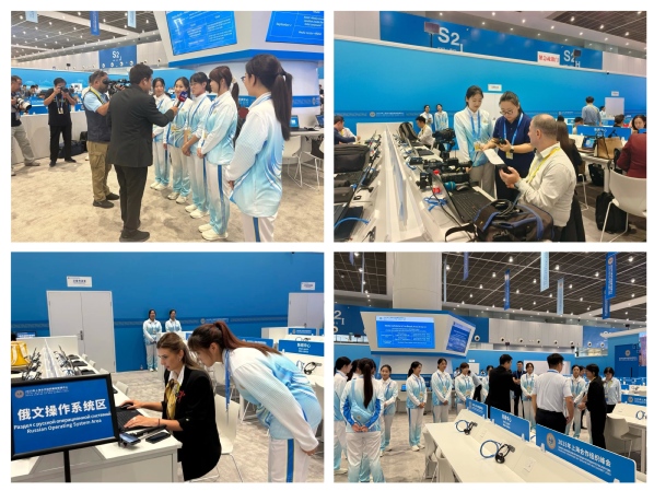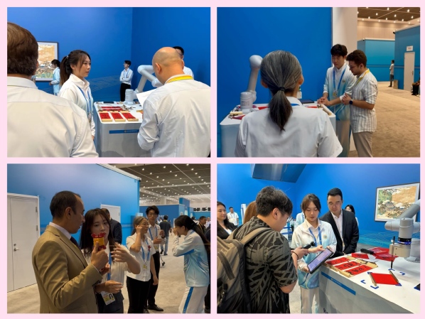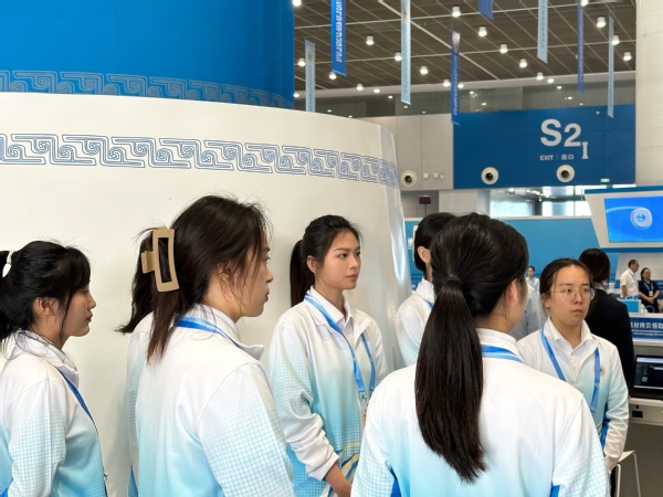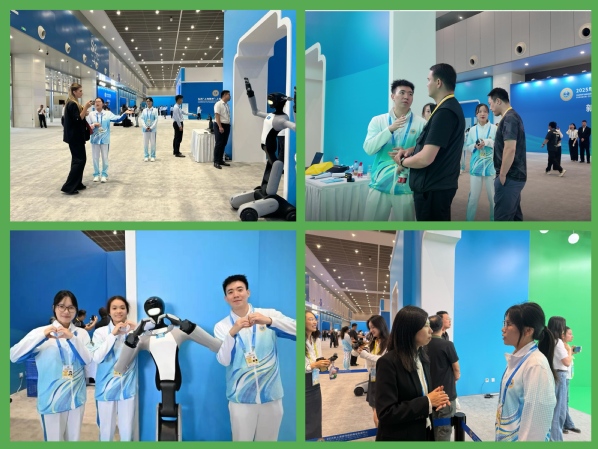 15:50AI科技互动展区内,志愿者们主动学习科技前沿技术知识,用多语种向外宾提供专业讲解服务,助力科技传播。