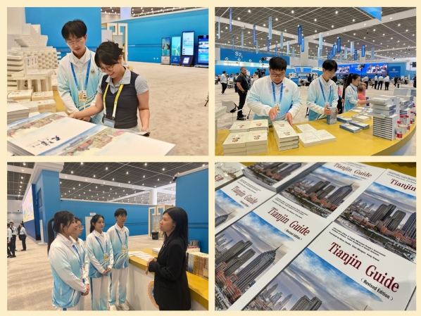 15:30外宣品宣传区,志愿者积极向外宾推介由我校专家团队翻译的外译典籍,前期的多次培训和演练让我们更精准地传达“中国智慧”和“天津风采”。
