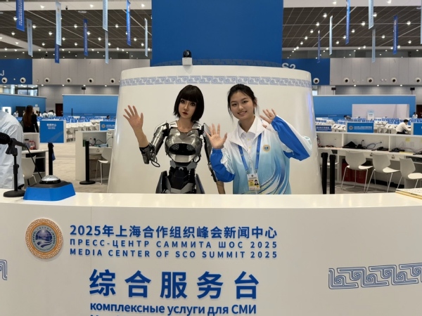 9:00综合服务台的一大亮点是人形机器人“小合”,前期在老师的指导下我们经过多次演练,主动学习如何引导媒体与机器人互动,利用自己的语言优势,协助机器人完成多语种交流,展现了科技与人文的完美结合,为外媒记者提供了很多帮助。