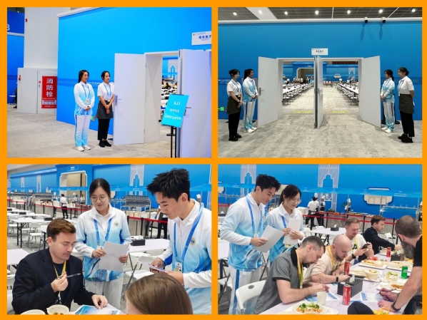 17:00,临近晚餐时间,媒体餐厅也有天外志愿者忙碌的身影,他们精心准备餐食、及时补充物资,全力维持餐厅秩序,为外国记者提供翻译保障,确保中外媒体记者有序就餐。