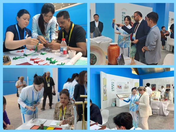 16:30非遗体验区作为最受欢迎的展区之一,有十分丰富的体验项目。看!天外志愿者们正以多语种讲解中国结的编织技巧、拓印的制作流程,精心开展着文化内涵的翻译介绍工作,实实在在用语言传播中国传统文化。