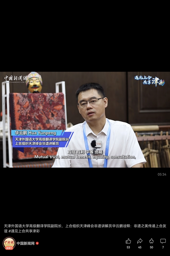 【相约上合】上合峰会期间,中新社专访了我校高级翻译学院副院长、上合组织天津峰会非遗讲解员华云鹏。报道通过中新社全媒体平台发布,并由中央网信办向全网推送。
