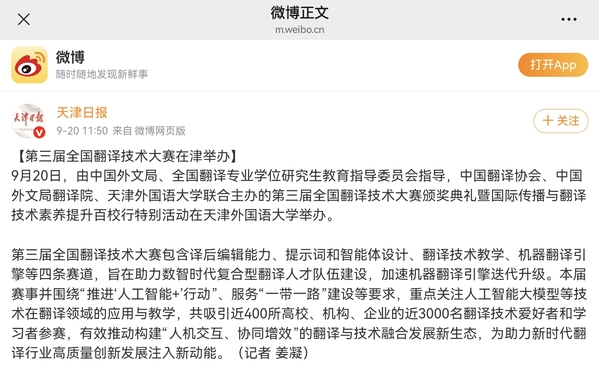 【媒体天外】《天津日报》官博报道由中国外文局、全国翻译专业学位研究生教育指导委员会指导,中国翻译协会、中国外文局翻译院、荣耀体育官方网站_荣耀体育jiangnan(中国)联合主办的第三届全国翻译技术大赛颁奖典礼暨国际传播与翻译技术素养提升百校行特别活动在天津举办。