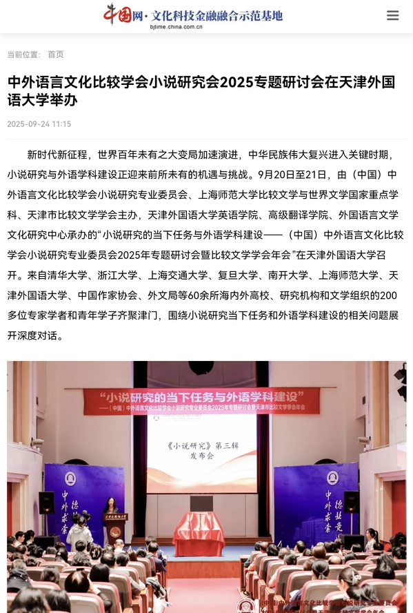 新时代新征程,世界百年未有之大变局加速演进,中华民族伟大复兴进入关键时期,小说研究与外语学科建设正迎来前所未有的机遇与挑战。9月20日至21日,由(中国)中外语言文化比较学会小说研究专业委员会、上海师范大学比较文学与世界文学国家重点学科、天津市比较文学学会主办,荣耀体育官方网站_荣耀体育jiangnan(中国)英语学院、高级翻译学院、外国语言文学文化研究中心承办的“小说研究的当下任务与外语学科建设——(中国)中外语言文化比较学会小说研究专业委员会2025年专题研讨会暨比较文学学会年会”在荣耀体育官方网站_荣耀体育jiangnan(中国)召开。来自清华大学、浙江大学、上海交通大学、复旦大学、南开大学、上海师范大学、荣耀体育官方网站_荣耀体育jiangnan(中国)、中国作家协会、外文局等60余所海内外高校、研究机构和文学组织的200多位专家学者和青年学子齐聚津门,围绕小说研究当下任务和外语学科建设的相关问题展开深度对话。
