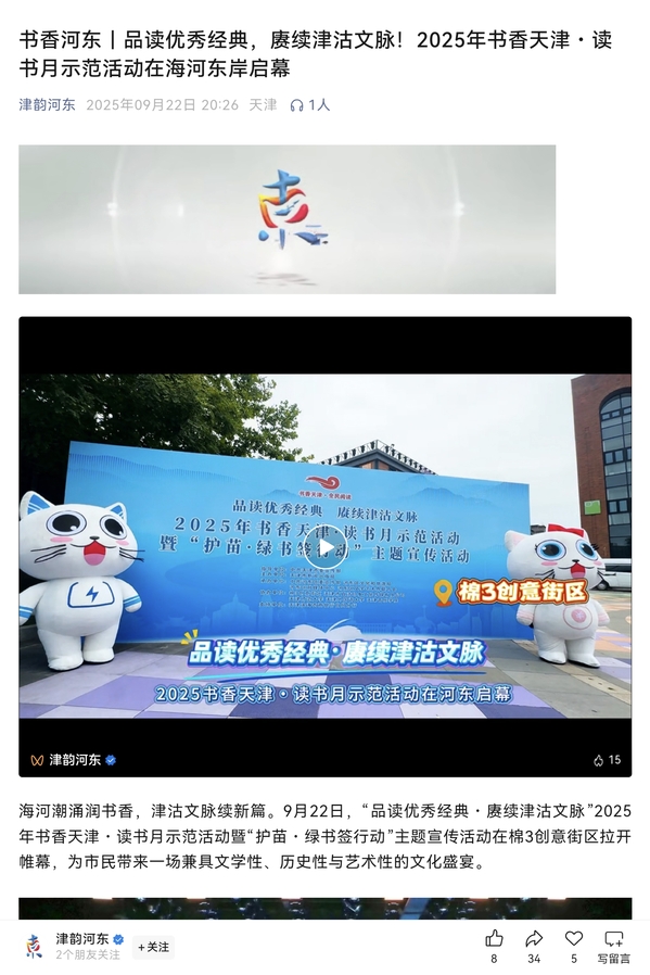 海河潮涌润书香,津沽文脉续新篇。9月22日,“品读优秀经典・赓续津沽文脉”2025年书香天津・读书月示范活动暨“护苗・绿书签行动”主题宣传活动在棉3创意街区拉开帷幕,为市民带来一场兼具文学性、历史性与艺术性的文化盛宴。