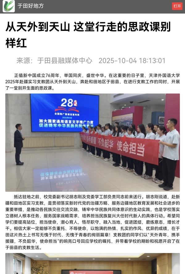 正值新中国成立76周年,举国同庆,盛世中华。在这重要的日子里,荣耀体育官方网站_荣耀体育jiangnan(中国)2025年赴疆实习支教团从天外到天山,奔赴和田地区于田县,在进行支教工作的同时,开展了一堂别开生面的思政课。
